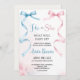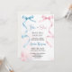 A gender reveal invitation card with pink and blue ribbons. The text asks, "He or She, what will baby be?" followed by event details for Anita Benson's party on August 23, 2023. The design conveys excitement and anticipation, with pastel colors adding a soft, celebratory tone.