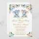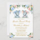 Moderno Elegante Aquarela Azul Branco Floral e Cor Branca Cor-de-Rosa Floral Elefantes Bebês Brancos Sexo Convite de festas Revelar Casal. Inclui belos rosas azuis de cor aquosa, rosas cor-de-rosa, flores brancas e verde botânico. Texto Dourado. Elefante Azul e Elefante Rosa com arcos.