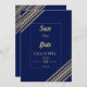 Elevate your Save the Date wedding style with these modern navy blue and gold invitations, featuring sleek geometric accents and elegant typography.