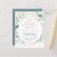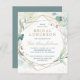 O convite à noiva de orçamento moderno, com uma estrutura geométrica rodeada por folhas de eucalipto e verde. Dentro são os detalhes de seu evento em verde escuro junto com o título e o nome da noiva a ser em um tom elegante de ouro, sobre uma lavagem a aquarela pastel com manchas de brilho sujo de ouro. A parte de trás é uma sombra correspondente de verde azul macio. Este simples e rústico convite é excelente para um almoço de noiva botânico temido. Estes convites para almoços de noiva baratos são impressos em folhas de papel para uma opção econômica.