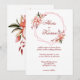Um convite de eterno com um aro geométrico ao redor dos seus nomes. O aro é adornado com coral, vermelho e borrado elementos florais. Seus primeiros nomes são apresentados em uma fonte elegante de script vermelho. Sobrenomes e outros detalhes são exibidos em fontes clássicas sofisticadas e sofisticadas. A parte de trás mostra seus nomes e data de casamento moldados por um buquê floral.