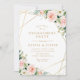 Um design moderno encantador com uma moldura geométrica dourada falsa elegante que envolve o texto e lindas flores de aquarela rosa. Um tema perfeito para o casamento de primavera e verão. O texto e as cores douradas neste modelo de convite de noivado podem ser personalizados.