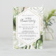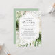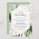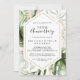 Este convite de aniversário de casamento de 50 anos é perfeito para uma celebração de casamento moderna. O design apresenta moldura geométrica adornada com folhas de palmeira e banana pintadas à mão em aquarela dourada e verde com flores cor-de-rosa agrupadas em buquês.
