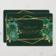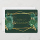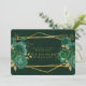 Design apresenta um elemento floral colorido impresso em tons de esmeralda verde e ouro. Texturas de canvas verde com falso quadro geométrico em ouro e florações de pedras com script de caligrafia em ouro ou escrevendo de tipo. Excelente para as comemorações do casamento!
