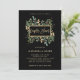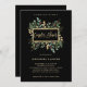 Este maravilhoso convite para casais de natal mostra verde-natal e folhas com folhas falsas de ouro e groselhas vermelhas, e um quadro central de ouro em um fundo negro moderno. Tendência correspondente a faux gold script typografia diz "casal chá".