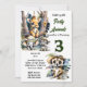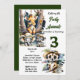 Um ai trendy e divertido 3D gerou um gráfico com uma linda e adorável zebra bebê vestindo um chapéu de safari colonial zebra listrado ; um elefante bebê com orelhas grandes vestindo um chapéu de disquete com flores sobre ele; uma girafa descansando com suas pernas dianteiras penduradas sobre o galho de uma árvore e um adorável meerkat sorrindo doidamente vestindo um chapéu colonial. Eles são colocados contra um fundo branco que tem modelos de texto personalizados; um grande modelo verde florestal para a idade das meninas de aniversário e verde-folha. O fundo é da mesma cor verde-escura. Estes são ideais para qualquer tema de festa de aniversário de verão da selva, safari, animal selvagem ou vida selvagem para crianças. Os downloads instantâneos incluem a parte frontal e traseira do convite.