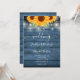 Com luzes bonito de cordas e girassóis em um fundo azul de madeira rústica, este elegante convite de casamento pode ser personalizado com suas informações especiais de evento. O reverso apresenta as iniciais do seu monograma num girassol correspondente. Projetado por Thisnotme©