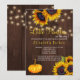 Pequena abóbora a caminho do baby shower convite rústico do país em uma madeira de celeiro marrom escuro com cordas de luzes cintilantes com girassóis amarelos e laranja pintados à mão e uma abóbora. ++++++++ Adequado para o verão ou outono menina ou menino baby shower ou festas de revelação de gênero.