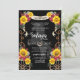 charro ocidental é um belo tema rústico para quinceanera ou celebração de aniversário. Este design apresenta girassóis amarelos brilhantes e rosas vermelhas ricas, sobre um fundo preto esmeraldo personalizável e sotaques ocidentais rústicos. Totalmente personalizável para qualquer tipo de evento!