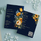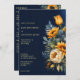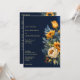 Marinho de casamento rústico de queda azul com flores girassosas amarelas marinho azul de fundo azul de fundo azul de fundo de ouro modelo de convite floral em um com código QR RSVP no verso.