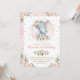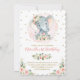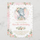Esta design feminina mostra uma ilustração de um adorável elefante bebê cercado por rosas rosa pinceladas de cor d'água lindíssima e confete com brilho dourado
