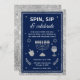 Erga um copo e gire o dreidel com este convite de Hanukkah elegante "Gire, Beba & Celebre". Com um fundo azul-marinho profundo com brilhos prateados em imitação a purpurina, este design combina tradição com um toque moderno. Um menorá cintilante é o centro da composição, rodeado por ícones festivos, incluindo um dreidel, um copo de vinho, Estrelas de Davi e floreios comemorativos. Perfeito para reuniões de adultos ou eventos comunitários animados, este convite define o tom para uma noite de alegria, jogos e companhia radiante.