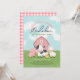 Celebrate your girls birthday with this cute farm animal barnyard invitation featuring a watercolor style pink barn, baby pig, cow, sheep, and chick. Fun and colorful, with “Our little farmer – [Name] is turning [age]!” on the front and classic pink gingham on the back. Perfect for a baby’s first or toddler’s farm birthday party! Customisable to any age.