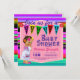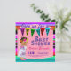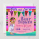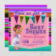 Convidado de chá de fraldas Fiesta com uma menina fofa vestindo um vestido Puebla colorido em um fundo de serape multicolor. Estes adoráveis convites para o chá de bebê Fiesta são facilmente personalizados para o seu evento simplesmente acrescentando os seus detalhes.