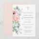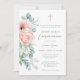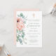 A softly beautiful girl's First Communion Invitation to celebrate this special moment in a child's life, this charming watercolor floral design has pink and peach roses and poppies with lovely trailing eucalyptus greenery along the left border. A matching soft pink cross placed above the text adds a thoughtful Christian element to the invitation. The elegant text template in popular sage green adds freshness and beauty to the overall look and feel of this charming design. This invitation is available in both printed and instant download digital formats for your convenience.