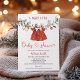 Sweet girl's winter or Christmas themed baby shower invitation featuring a red and white baby dress, shoes and rattle. Ideal for a girl's December baby shower.