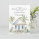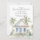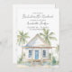 Convite Tropical Bachelorette. Ponha o tom para uma solteira tropical de praia e divertida, ou para o fim de semana das raparigas, com esta charmosa design. A frente apresenta um fundo branco limpo com o texto exibido no topo, chamando a atenção para o belo trabalho de arte de aquarela na parte inferior. Uma casa de praia pitoresca, pintada em branco e bronzeada com uma porta azul e janelas, é cercada por palmeiras verdes, dunas arenosas e grama de praia, criando a vibração perfeita à beira-mar. O verso mantém o design simples e moderno com um fundo branco e fontes de cinza para o itinerário do fim de semana e detalhes da festa. Personalize o itinerário para refletir os seus planos ou deixe-o vazio para uma aparência limpa e minimalista. Este convite é ideal para viagens de festas de solteira tropicais e costeiras ou de raparigas para destinos como a Flórida, a Califórnia, o México, a Carolina do Sul, os Hamptons ou qualquer zona de praia da Costa Leste. Disponível como cartão impresso ou arquivo digital para download para fácil compartilhamento e impressão local.