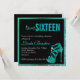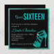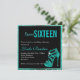 Doce dezesseis convite com salto alto de vidro em aqua falso glittery em um fundo preto com uma estrutura aqua parecendo divertida, mas elegante. Personalize este convite com seu nome e surpreenda seus amigos e sua família com este convite único e generoso. Deixe sua festa ser um sucesso a partir dos convites. Também existem selos de etiquetas de autocolantes disponíveis na nossa loja.