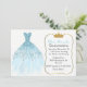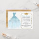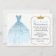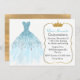 Convite de aniversário Glamoroso de Quinceanera com gráficos de um vestido de aquamarina brilhante, em fundo branco. Uma área de texto decorativo em forma de esboço de ouro, no lado direito do convite, é decorada com uma coroa ouro no topo. A parte de trás dos convites é feita com um tom de ouro. Personalize o texto para o dia especial da sua filha.