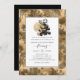 Convite de casamento com rosas pretas e douradas e um fundo damasco vintage com lâmina dourada brilhante.