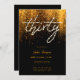 Modelo de convite de festas de vidro, moderno, elegante e chic com fundo preto com poeira dourada (efeito digital), a palavra PARTIDO coberta por rochas (simulação, não pedras reais, este é um efeito digital também), roteiro de caligrafia moderno e tipografia em tons de ouro. Um design de eterno para uma mulher no seu trigésimo aniversário.