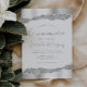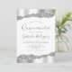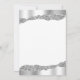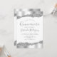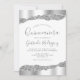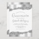 Um convite de festas de vitamina quinceañera com bordas superiores e inferiores de folha fina prateada e brilho. A palavra "Quinceañera" e o nome do convidado de honra aparecem na escrita de cinzas moderna, com o texto remanescente na fonte clássica sans serif. O verso da placa repete a folha prateada e o design brilhante.