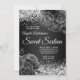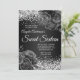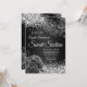 Um convite elegante para comemoração de 16 anos. Embora não esteja definido como um modelo, você pode mudar o texto "16 doces" para corresponder ao seu evento especial. Brilhante e brilhante brilho prateado preto contra uma imagem negra e cinza. A caligrafia clássica do monograma do rico pode ser excluída ou personalizada. Doce 16 convites de festa de aniversário para sua filha. Todos os elementos brilhantes e reluzentes neste design de gradiente moderno são gráficos digitais que impressão com tintas como se fossem fotos.