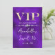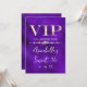 Este convite de festa personalizado apresenta um design VIP glamoroso em um fundo de textura roxa. O título VIP é impresso em uma fonte estilo folha de ouro, seguido pelo título do evento. Uma faixa de diamantes separa o texto. O local e horário da festa ou evento são impressos no verso. É perfeito para uma festa de aniversário, sweet 16, chá de noiva ou outra celebração elegante.