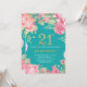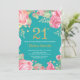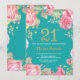 Convite para aniversário de 21 anos Floral para Mulheres. Flor Botânica De Aquarela. Dourada Glitter. Fundo do Teal Aqua Turquoise. Flores Florais De Peões Rosa. Aniversário Adulto.