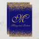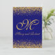 Um convite moderno e elegante, com os nomes da noiva e do noivo em ouro profundo, sobre um rico fundo azul real, coberto de um confete dourado. A placa se reverte para o texto em um grande retângulo azul enquadrado em brilho dourado. Você pode personalizá-lo completamente clicando no link personalizar. Isso faz parte de uma suíte de casamento luxuosa que inclui muito mais essencial.