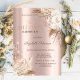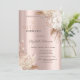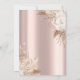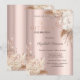 Um convite moderno, chique e glamoroso com gotas de glitter e flores boho em um fundo rosa dourado.