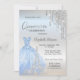 Vestido azul elegante, torre Eiffel e brilho prateado pingam em fundo prateado.
