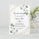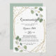 Este convite de Quinceañera, que brilha a ouro, é perfeito para uma simples festa de aniversário de 15. O design apresenta ramificações botânicas verdes de eucalipto desenhadas à mão e folhas enfeitando uma moldura geométrica dourada com brilho.
