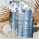Um moderno, chique e glamouroso com gotas de luz prateada, e balões sobre um fundo metálico azul.