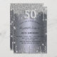 Um convite moderno, na moda e glamouroso para a 50ª festa de aniversário. Um fundo com aparência de prata falsa, decorado com poeira brilhante. Personalize e adicione seu nome e detalhes da festa. O número 50 é escrito com uma fonte de estilo balão, script.