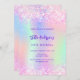 Um convite de aniversário 10º feminino. Na frente: Um arco-íris, fundo holográfico colorido em roxo, rosa, verde-menta. Decorado com confete cor-de-rosa penteado. Personalize e adicione um nome e detalhes da parte. O nome é escrito com um script de estilo manuscrito, letras cor roxa.