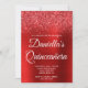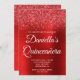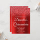 Crie seu próprio convite para comemoração de 15 de na moda para sua filha. Gráficos cintilantes vermelhos brilhantes decorativos formam uma borda superior. A arte digital de fundo apresenta uma folha de metal esfregada brilhante, brilhante e brilhante, estilo ombre vermelho. Personalize a cor do texto branco do convite ou os estilos de fonte. O texto "Quinceanera" também é personalizável. Os faíscas, brilho e folha de luxo serão criados por elementos artísticos que impressão gostam de uma foto.
