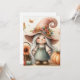 Convite de festa de aniversário minimalista com texto de caligrafia e fundo de aquarela de gnome menina de outono e folhas e abóboras de outono em cores neutras de outono.