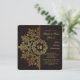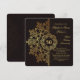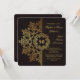Um convite luxuoso para celebrar seu evento mais formal. O fundo escuro tem um padrão abstrato marrom e é sobreposto por uma repetição do padrão em dourado. A grinalda em destaque pode conter monogramas ou um ano. A escolha perfeita para impressionar. Quer economizar dinheiro? Imprima com os cantos quadrados básicos.