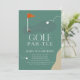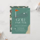 This retro modern kid's birthday golf party/par-tee invitation features a red flag and golf balls with a fairway and bunker in a golf course . The reverse side features a dark green background with a golf ball and tee pattern. Personalize it for your needs. You can find matching products at my store.