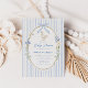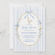 The invitation showcases a soft blue striped background, providing a serene and inviting canvas that evokes the freshness of springtime. At the heart of the design is a hand-painted oval frame, elegantly adorned with an illustration of a mother goose nestled among white and blue flowers. This playful and sweet imagery adds a sense of joy and anticipation to your announcement.