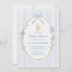 The invitation showcases a soft blue striped background, providing a serene and inviting canvas that evokes the freshness of springtime. At the heart of the design is a hand-painted oval frame, elegantly adorned with an illustration of a mother goose and gosling nestled among white and blue flowers. This playful and sweet imagery adds a sense of joy and anticipation to your announcement.