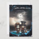 At the heart of this striking invitation is an illustration of a skeleton bride and groom, standing side by side in a sombre manner that radiates both goth romance and eerie sophistication. They stand against a backdrop of lightning lit stormy skies out at sea and at the entrance to an ominous cave. Bio luminescent water glows a dramatic blue at their feet as they enter the realms of the unknown, enhancing the overall sense of grandeur and mystery.