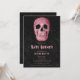 This gothic dusty pink skull head baby shower invitation design features a vintage spooky Halloween goth style typography on a black texture old fashioned antique style grunge background. Image copyright Marg Seregelyi Photography.