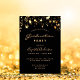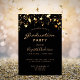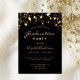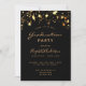 Um cartão de convite glamouroso para uma festa de formatura de 2025 (ou qualquer ano) para ele e para ela. Um fundo preto decorado com estrelas douradas falsas. Personalize e adicione um nome e detalhes da parte. O texto Graduação e o nome são escritos com um script de estilo moderno, escrito à mão. Texto colorido do ouro. Fundo: fundo preto e estrelas ouros.