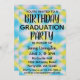Use este Convite de festas de Aniversário de Graduação Um Corante Azul de Foto para lançar a sua criança a melhor combinação de aniversário e festa de formando. Apresenta um fundo do estilo de coloração de gravata azul, amarela e branca. Personalize com os detalhes da sua festa e uma foto favorita no verso.