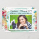 Um convite maravilhosamente único e feliz com flores coloridas e fundo aquosos, com brilho dourado. A parte traseira da carta tem flores e borda brilhante. As cores do texto podem ser alteradas se desejar - basta clicar em "personalizar mais" para escolher uma cor diferente. Personalize com suas informações e sua foto do formando. Design ©2019 Rosalind Moore, Design de Cherry Lane.