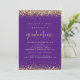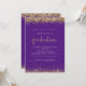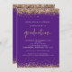 Convite para Graduação Dourada Roxo Elegante. As bordas de confete de falso ouro elegantes estão no topo e no fundo e também no verso. A graduação é feita no estilo moderno de escrita manual. Personalize facilmente o resto do texto para você.