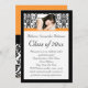 Este convite é totalmente personalizável para o seu texto. Um convite adorável da nossa galeria de convites para a formatura. Escolha o design perfeito para a sua adolescente favorita para combinar com o tema da recepção, a cor do vestido ou o tema da dança. Design feminino, preto e branco, com sotaques cor de laranja frescos, junto com uma foto personalizada solteiro.