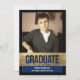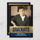 Fundo azul-escuro real, quadro preto de cor superior com efeito de folha de ouro e recorte "Formando" perfeitamente personalizado com o nome do formando, a escola e a fotografia. A imagem impressa em folha de ouro é sofisticada e elegante por celebrar a grande conquista do formando masculino ou de qualquer um!